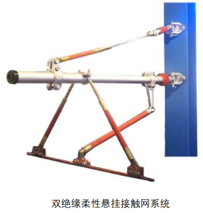 有轨电车-双绝缘柔性悬挂接触网系统中腕臂绝缘子和拉线绝缘子将支柱和腕臂支撑系统绝缘,绝缘定位器和绝缘吊索将接触线和腕臂定位装置绝缘,整个装置实现接触线和支柱双重绝缘,安全可靠性高。